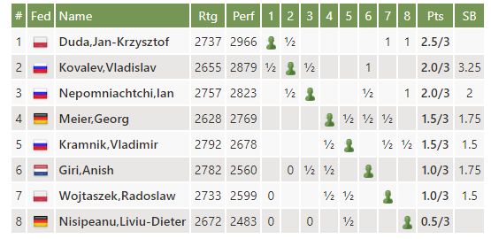 Kovalev og Nepo eru í 2.-3. sæti með 2 vinninga. Stöðuna má finna hér.
