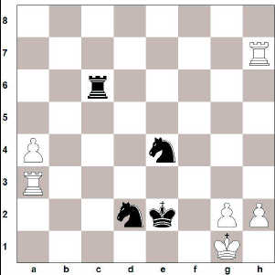 …og keppendur sömdu um jafntefli! Upp varð fótur og fit og enginn gat útskýrt hvers vegna en þá kom á daginn að eftir margra klukkustunda rannsóknir hafði Ísraelsmaðurinn Jacob Murey fundið magnaða björgun í stöðunni sem kemur upp eftir 42. … Kf7 43. Dh7+ Ke8 44. Dg8+ Kd7 45. Hxd3+ Kc8 46. Hxd8+ Bxd8 47. Kg1!!