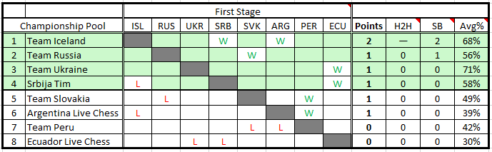Ísland er sem stendur í 1. sæti í leifturskákinni en einhver lið eiga enn eftir að ljúka sínum viðureignum.