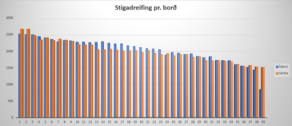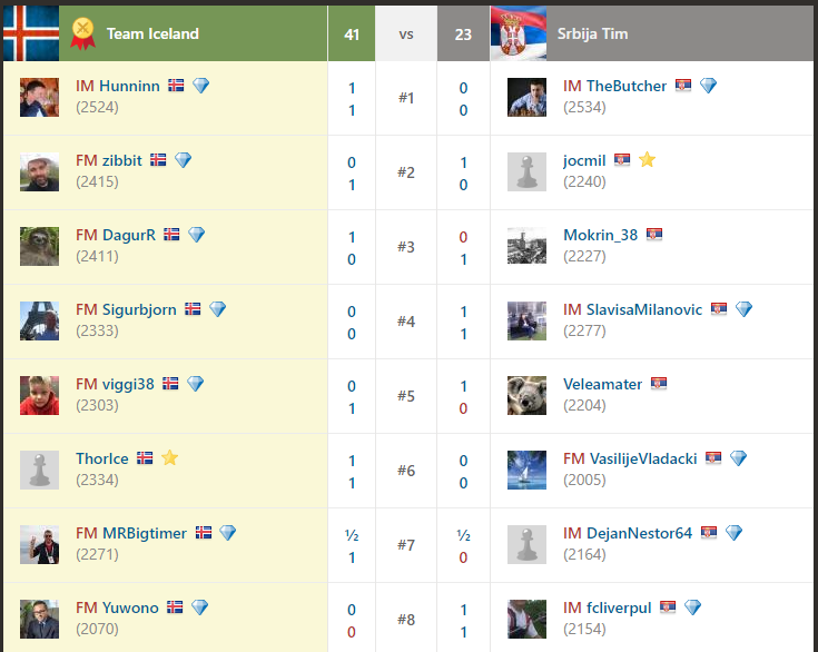 Lið Íslands er vissulega nýtt í keppninni, en það er ekki þar með sagt að það sé á flæðiskeri statt þegar kemur að mönnun. Hefðu Serbar „gúgglað betur“, þá hefði þeim mátt vera ljóst að breiddin í liði Íslands er gríðarleg. Líkt og áður sagði mættu Serbar með sjö titilhafa – Ísland mætti með þrettán. Meðalstig Íslendinga voru 2040 en meðalstig Serba aðeins 2001 stig. Teflt var á 39 borðum.