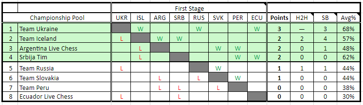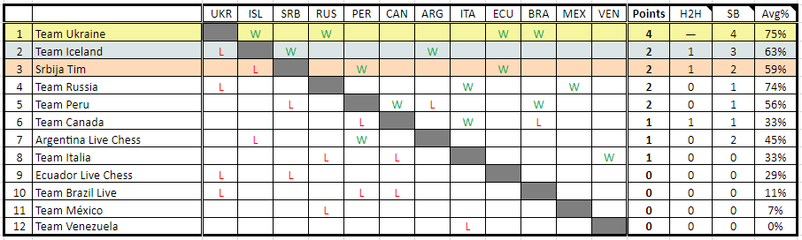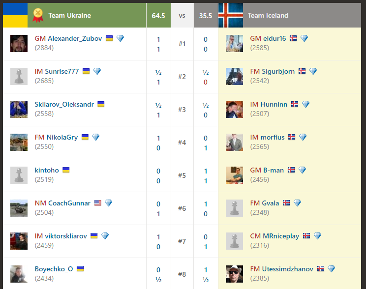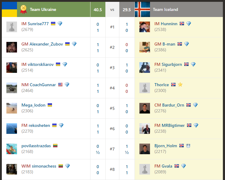 Lið Úkraínu var því miður öllu sterkara að þessu sinni, en meðalstig þeirra voru 2131 gegn 1993 meðalstigum Íslendinga. Úkraínumenn voru því heldur starkari á nánast öllum borðum og unnu nokkuð öruggan 64.5 – 35.5 sigur.