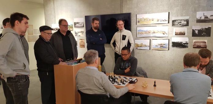 Hrafnhildur Hallvarðsdóttir, forseti bæjarstjórnar í Stykkishólmi lék fyrsta leikinn fyrir Jón í skák hans gegn Jóni. Teflt er við afar góðar aðstæðu í Amtbókasafninu í Stykkishólmi.