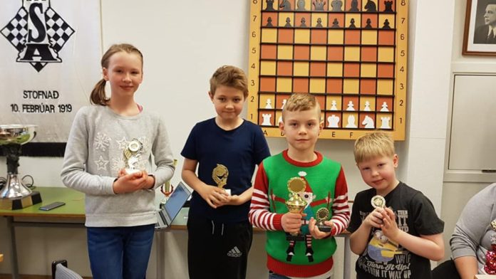 Eins og undanfarin ár var efnt til uppskeruhátíðar Skákfélag Akuryrar nú um miðjan desember þar sem verðlaun voru afhent fyrir haustmisserið meður ljúflegri næringu á sál og líkama. Við byrjuðum á móti fyrir börnin kl. 11 á sunnudaginn og nefndum „vinamót“ enda þau sem æfa með okkur hvött til að taka með sér vin. Það gerðu að vísu fáir, en mæting var þó með ágætum og alls tóku 17 börn þátt í mótinu. Þar var hart barist og drengilega. Lokastaðan:
