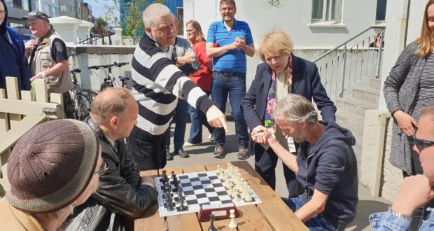 Frú Vigdís Finnbogadóttir fv. forseti lék fyrsta leikinn fyrir Inga Tandra á móti Tómasi Björnssyni á sumarmótinu í frábæru veðri. Sjálfboðliði í Vin sem heitir líka Vigdís frá Danmörku og heitir í höfuði á fv. forseta lék svo fyrsta leikinn hjá Róbert Lagerman.