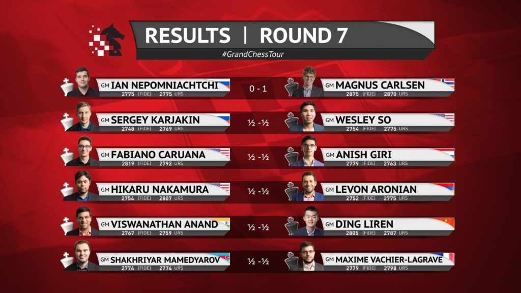 Magnús Carlsen (2875) vann Ian Nepomniachtchi (2775) í sjöundu umferð Grand Chess Tour-mótsins í Zagreb í gær. Fyrsti sigur heimsmeistarns á Nepo í kappskák. Góð skák. Magnús fórnaði peði sem Rússinn tók á rangan hátt og þurfti að leggja niður vopnin nokkrum leikjum síðar. Öðrum skákum lauk með jafntefli og er Magnús því nú einn efstur á mótinu.