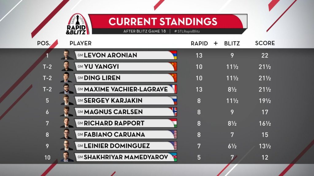 Levon Aronian vann sigur á at- og hraðskákmótinu í St. Louis sem lauk í gærkveldi. Mótið er hluti af Grand Chess Tour. Armeninn fékk 22 stig af 36 mögulegum. Varð hálfu stigi fyrir ofan Yu Yangyi, Ding Liren og MVL. Tefldar voru 9 atskákir og 18 hraðskákir. Atskákirnar giltu tvöfalt.
