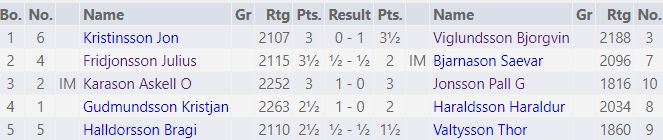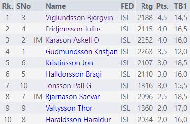 Björgvin hlaut 4½ í 6 skákum og var taplaus. Vann tvær síðustu umferðirnar. Júlíus varð í 2.-3. sæti ásamt Áskeli Erni Kárasyni (2252). Júlíus fékk silfrið eftir stigaútreiking.