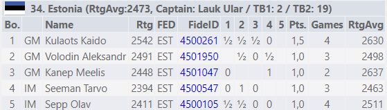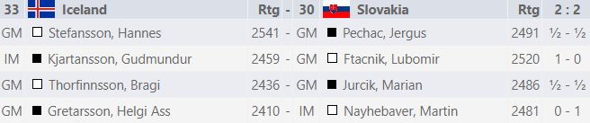 Ísland hefur 2 stig og 6 vinning og er í 36. sæti af 40 löndum. Á morgun er afar mikilvæg viðureign þegar við mætum Eistum erum afar áþekkir okkur að styrkleika. Lið Eista