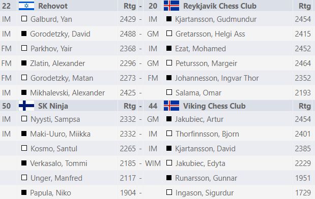Sjöunda og síðasta umferð fer fram í dag. TR mætir ísraelsku sveitinni Rehovot sem er áþekk þeim að styrkleika. Víkingar mætta finnsku sveitinni Ninja sem er sömuleiðis áþekk þeim að styrkleika. Páll Agnar Þórarinsson hvílir í dag. Það má því búast við jöfnum og spennandi viðureignum í dag. Viðureign TR ætti að vera í útsendingu.