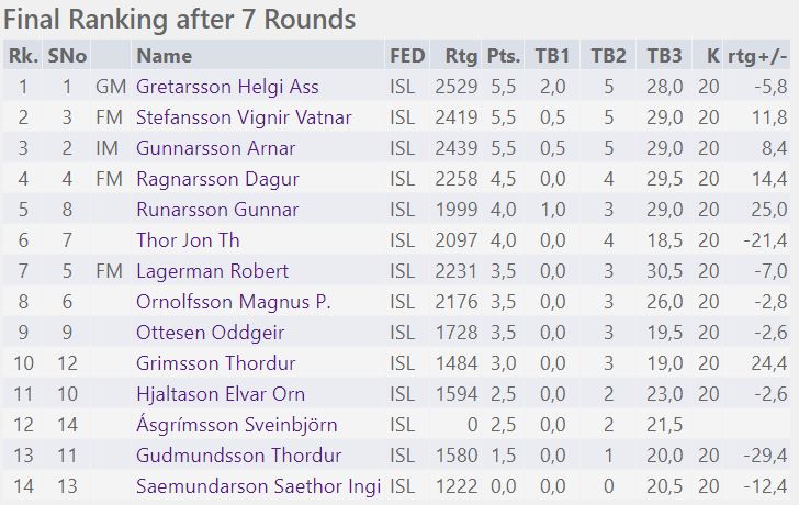 „Áfram Helgi!“ hefur Helgi kyrjað innra með sér á þessum tímapunkti og hann tryggði sér sigur með því að leggja bæði Vigni og Arnar að velli í tveim síðustu umferðunum. Þetta þýddi að þeir voru allir þrír jafnir að vinningum með 5.5 en Helgi vann á stigaútreikningi enda lagði hann báða keppendur að velli.