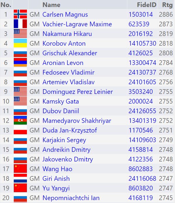 Tuttugu stighæstu keppendur HM í atskák eru: