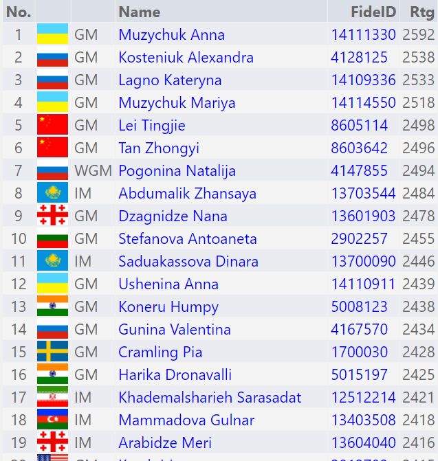 Samhliða fer fram HM kvenna í atskák. 20 stigahæstu keppendurnir eru: