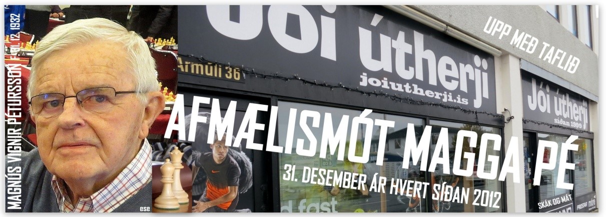 Magnús V. Pétursson, fv. forstjóri, hinn mikli öðlingur og víðfrægi milliríkjadómari í handbolta og knattspyrnu, fagnaði 87 ára afmæli sínu á gamlársdag. Hann er einn virkasti eldri skákmaður landins, þó Páll G. Jónsson og Gunnar Kr. Gunnarsson, fylgi honum fast á hæla, en þeir verða báðir jafngamlir honum nú í vor. Að venju heldur Magnús upp á aldursáfangann með myndarlegu afmælismóti og veislufagnaði í Stangarhyl, sjálfum sér og skákfélögum hans til yndisauka, á morgun, þriðjudaginn 7. janúar. Þetta er VIII. afmælismót hans í röðinni.