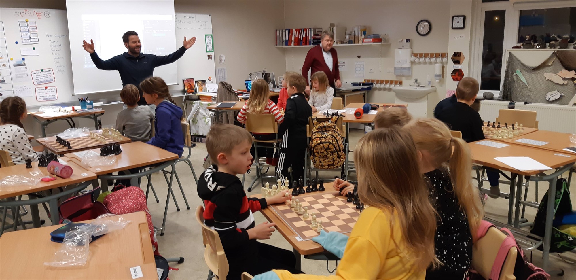 Fræðsluverkefni Skáksambands Íslands sem hófst fyrir áramót er nú komið á fullt skrið að nýju. Í síðustu viku var Stóru-Vogaskóli í Vogum á Vatnsleysuströnd heimsóttur. Tilgangur með heimsóknum Skáksambandsins er að skilja eftir í skólanum þekkingu á hvernig megi kenna skák og standa að skákstarfi. Stefán Bergsson og Gunnar Björnsson leiðbeindu nemendum í öðrum til fimmta bekk meðan bekkjarkennarar fylgdust með. Áhersla var lögð á ýmsa einfalda skákleiki með færri taflmönnum og hvernig megi kenna þá. Þá voru kennslumöguleikar chess.com kynntir sem og síðan skakkennsla.is.