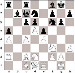 4…. d6 5. c3 a6 6. Ba4 Be7 7. 0-0 0-0 8. He1 He8 9. Rbd2 Bf8 10. h3 b5 11. Bc2 Bb7 12. d4 g6 13. a3 Rb8 14. d5 c6 15. c4 Rbd7 16. a4 Dc7 17. b3 Hec8 18. Ha2 bxc4 19. bxc4 a5