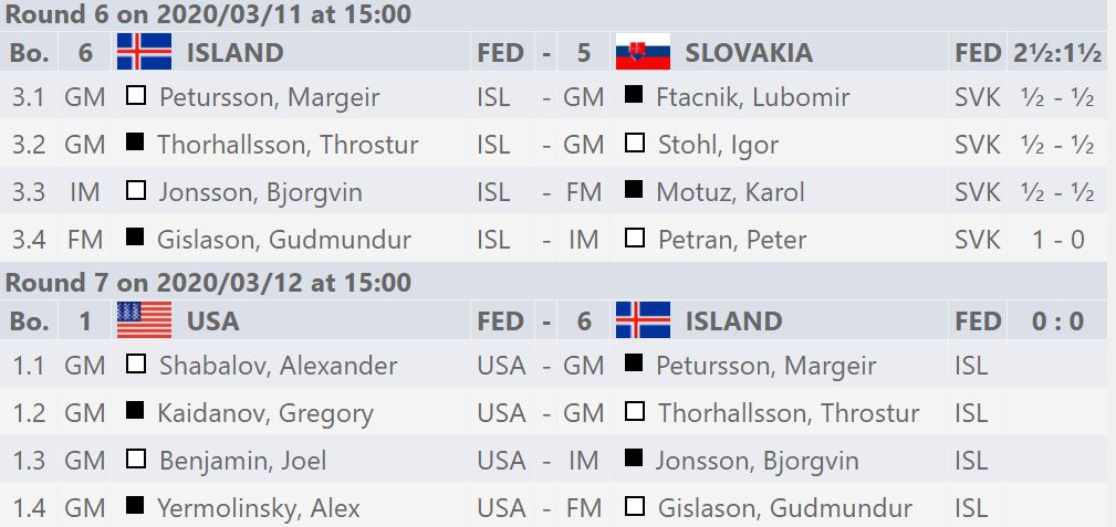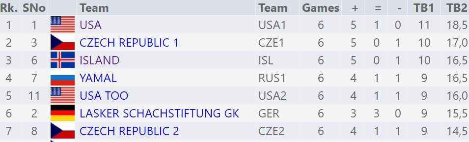 Íslenska sveitin er í þriðja sæti með 10 stig af 12 mögulegum. Ísland mætir heimsmeisturum Bandaríkjanna í sjöundu umferð sem fram fer í dag. Alls eru tefldar níu umferðir. Bandaríska liðið er það langsterkasta en það skipa fimm stórmeistarar. Kanarnir eru efstir með 11 stig en auk Íslendinga hafa Tékkar 10 stig.