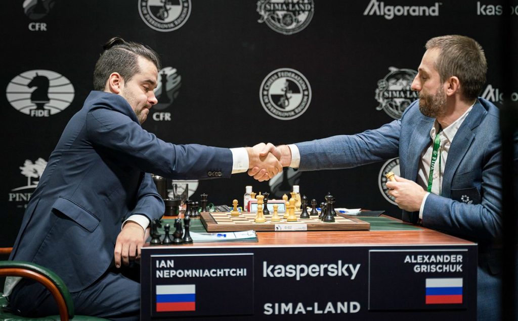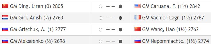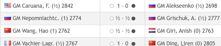 Nepo og Grischkuk gerðu jafntefli (2777). Anish Giri mátti teljast ljónheppinn að sleppa með jafntefli gegn Wang Hao (2762).