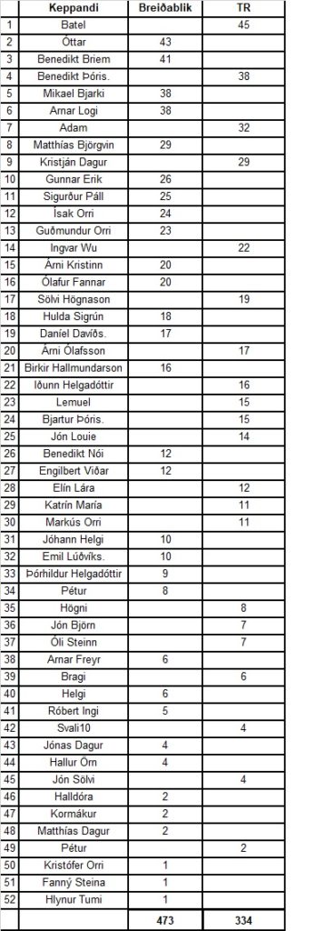 Stigafjöldi einstakra liðsmanna og lokastaðan: