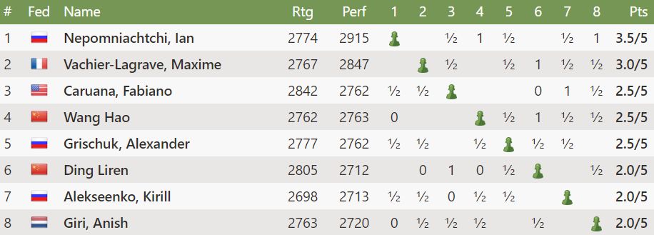 Sjötta umferð fer fram á morgun og hefst kl. 11. Þá mætast: Grischuk-Caruana, Alekseenko-Giri, Nepomniachtchi-Ding, Wang-Vachier-Lagrave.