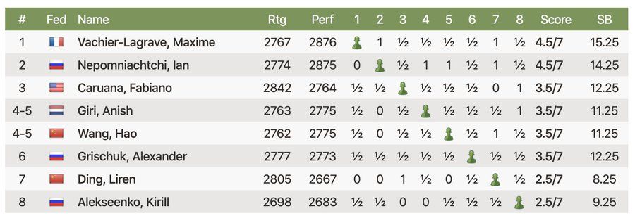 Caruana-Vachier-Lagrave, Wang-Ding, Nepomniachtchi-Giri, Alekseenko-Grischuk.