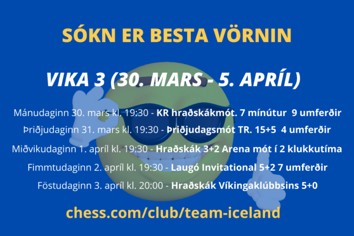 Félag Íslendinga á Chess.com, Team Iceland, mun standa fyrir fjölmörgum skákviðburðum á netinu næstu vikurnar. Leitast verður við að spegla vinsæla skákviðburði og fasta liði í mótaáætlun skákhreyfingarinnar.