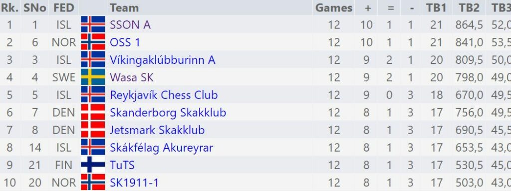Spennan fyrir lokaumferð Norðurlandsmóts skákfélaga er gríðarleg. SSON (Selfoss) og OSS (Osló) eru á toppnum með 21 stig af 24 mögulegum. Víkingaklúbburinn og sænski klúbburinn Wasa eru í 3.-4. sæti með 20 stig. Öll þessi fjögur lið geta unnið keppnina.