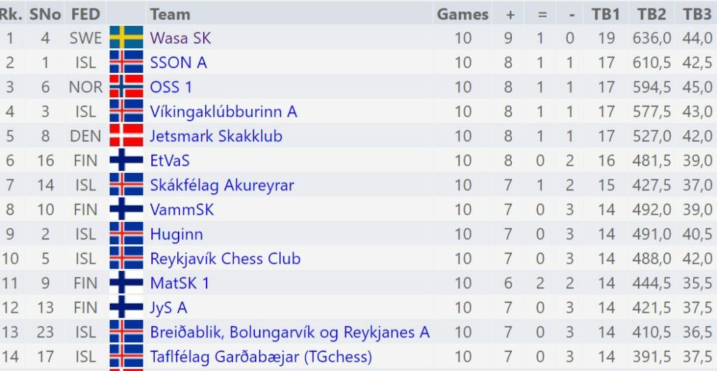 Sænski klúbburinn Wasa SK er á toppnum með 19 stig. Með þeim tefla meðal annars stórmeistararnir Bassem Amin og Ferdindand Hellers.