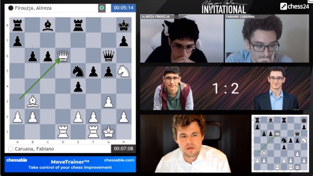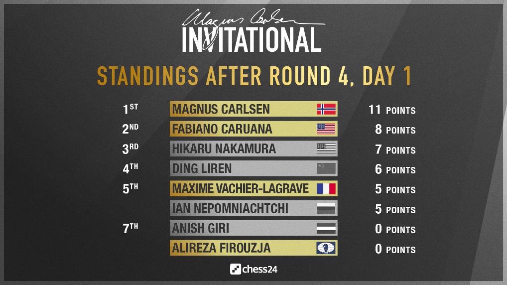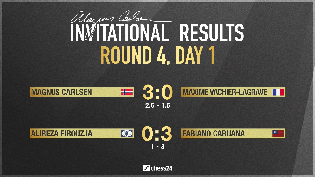 Fyrri hluti fjórðu umferðar Boðsmóts Magnúsar Carlsen fór fram í gær. Magnús (2881) er í banastuði og lagði Maxime Vachier-Lagrave (2860) að velli 2½-1½. Hefur unnið sigur í öllum fjórum einvígunum. Fabiano Caruana (2773) hafði 3-1 sigur á ungstirninum Alireza Firouzja (2703) sem hefur ekki náð að sýna sínar allra sterkustu liðar enda aðeins 16 ára.