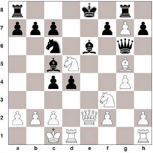 3. … exd4 4. Rf3 Bc5 5. e5 d5 6. exf6 dxc4 7. De2 Be6 8. fxg7 Hg8 9. Bg5 Dd5 10. Rc3!