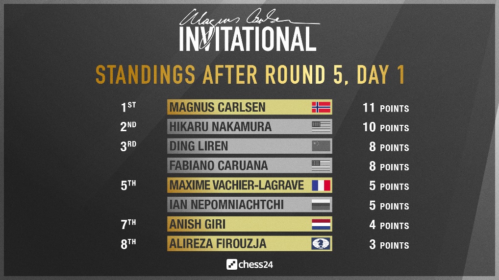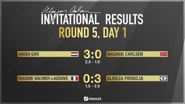 Það urðu heldur betur óvænt úrslit í fyrri hluta fimmtu umferð Boðsmóts Magnúsar Carlsen sem fram fór í gær á Chess24. Anish Giri (2731) vann Magnús Carlsen (2881) og Alireza Firouzja (2703) lagði Maxime Vachier-Lagrave (2860) að velli. Báðir höfðu þeir tapað öllum sínum viðureignum hingað til.