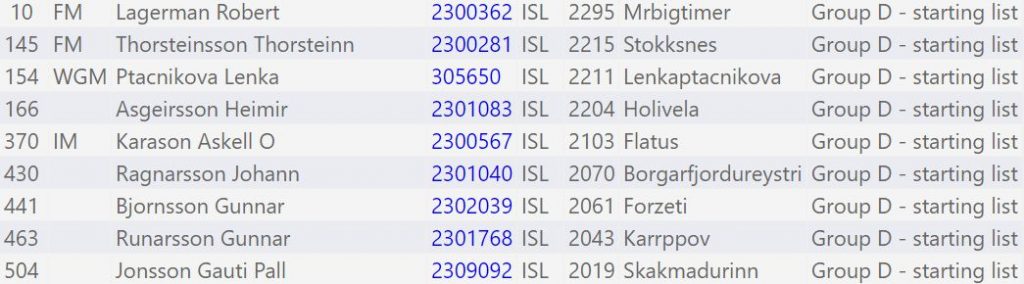Skráning í b-flokk (2001-2300) lýkur í dag kl. 16. Níu íslenskir skákmenn eru skráðir til leiks í b-flokkinn. Nýlegar skráningar gæti vantað. Undankeppnin í b-flokknum fer fram á mánudaginn og úrslitakeppnin á þriðjudaginn.
