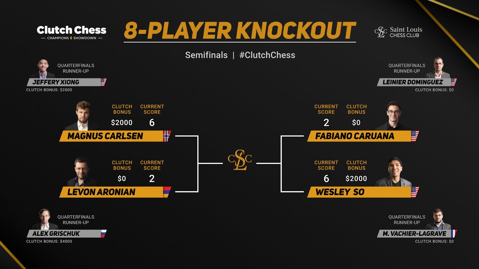 Undanúrslit ögurskákmótsins á LiChess sem skákklúbburinn í Saint Louis stendur fyrir hófust í gær. Heimsmeistarinn Magnús Carlsen og Wesley So byrjaðu vel og eru báðir í 6-2 forystu á móti Levon Aronian og Fabiano Caruana. Sá forysta getur farið fljótt því lokaskákirnar báðum í einvígunum gilda þrefalt.