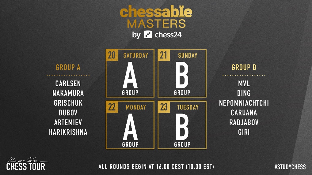 Chessable Masters hefst í dag. Það er eitt af mótunum í mótasyrpu Magnúsar Carlsen. Þátt taka 12 skákmenn og tefla í tveimur flokkum.
