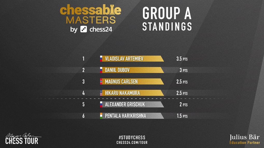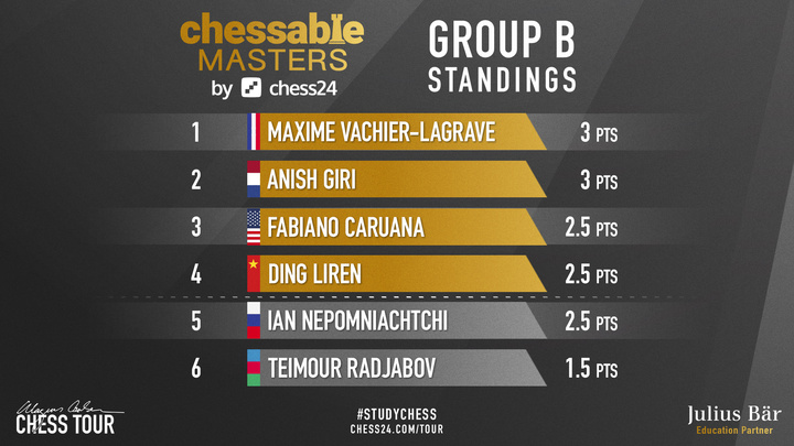 Chessable Masters hófst í fyrradag á Chess24. Þátt taka 12 skákmenn og tefla í tveimur flokkum. Tefld er tvöföld umferð og komast fjórir efstu úr hvorum flokki í átta manna úrslit þar sem teflt verður eftir útsláttarfyrirkomulagi.