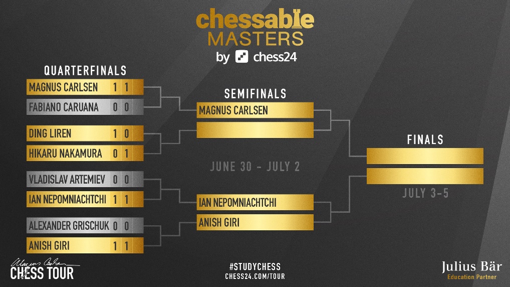 Anish Giri tryggði sér keppnisrétt í undanúrslitum Chessable Masters með 3-1 sigri í öðru einvígi hans við Alexander Grischuk. Giri mætir þar Ian Nepomniachtchi. Mikið gekk á í öðru einvígi Hikaru Nakamura og Ding Liren. Þar vann Nakamura sigur eftir bráðabana eftir að hafa jafnað metin með sigri í lokaskákinni í bæði atskákinni og hraðskákinni.