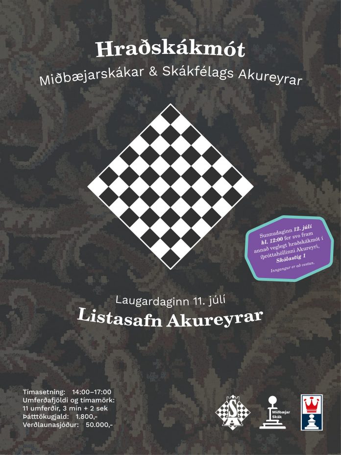 Síðast en ekki síst – Sunnudaginn 12. júlí kl. 12:00 fer svo fram annað veglegt hraðskákmót í íþróttahöllinni Akureyri, Skólastíg 1. Inngangur er að vestan. Skráning verður á staðnum í það mót.