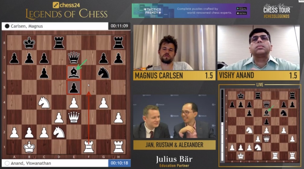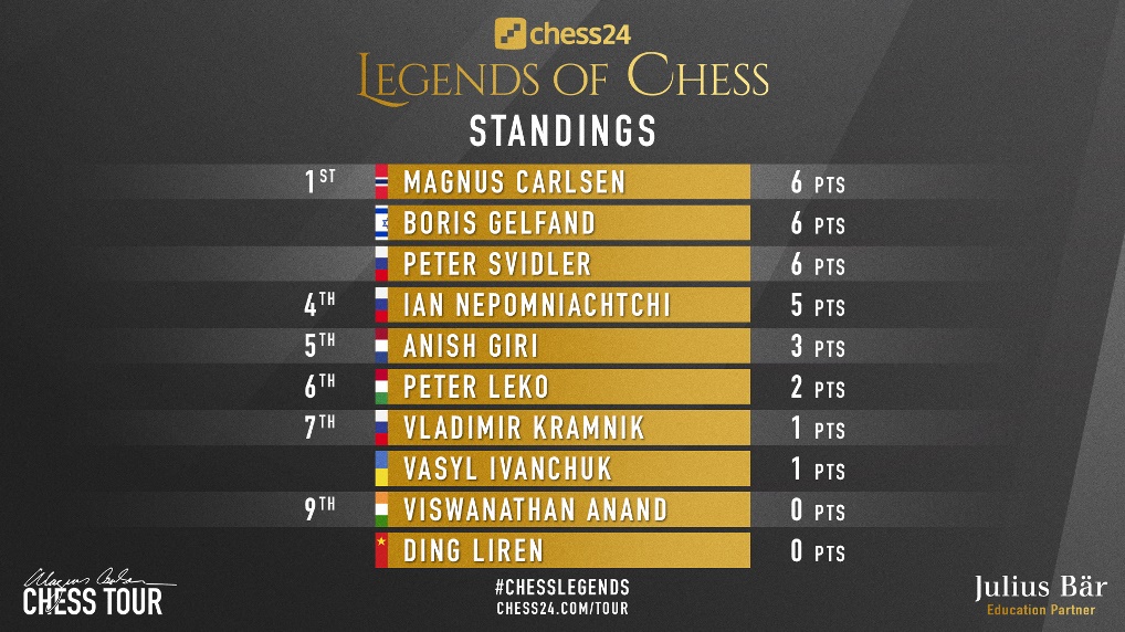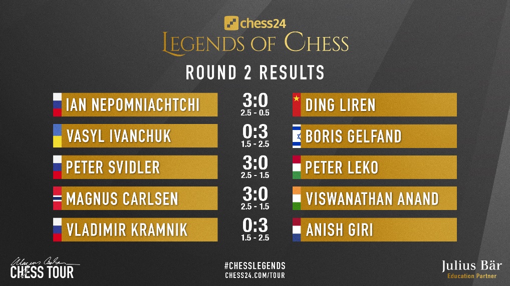 Magnús Carlsen, Boris Gelfand og Peter Svidler eru efstir og jafnir með 6 stig að loknum tveimur umferðum á Skákgoðsagna-mótinu á Chess24. Magnús vann Vishy Anand, Boris lagði Vassily Ivanchuk að velli og Peter hefði betur gegn nafna sínum Leko.