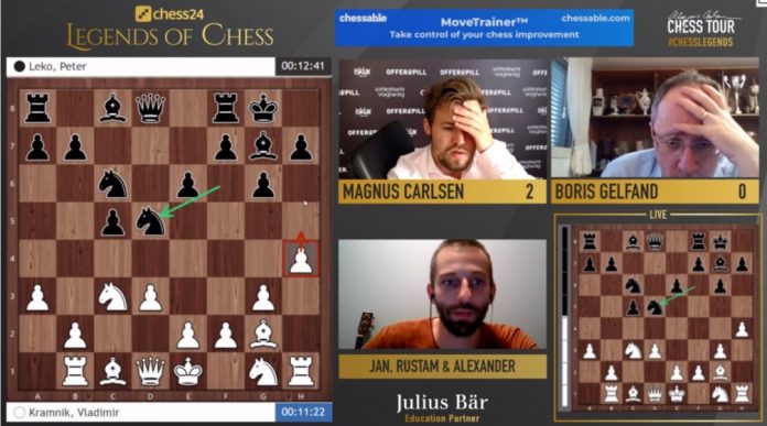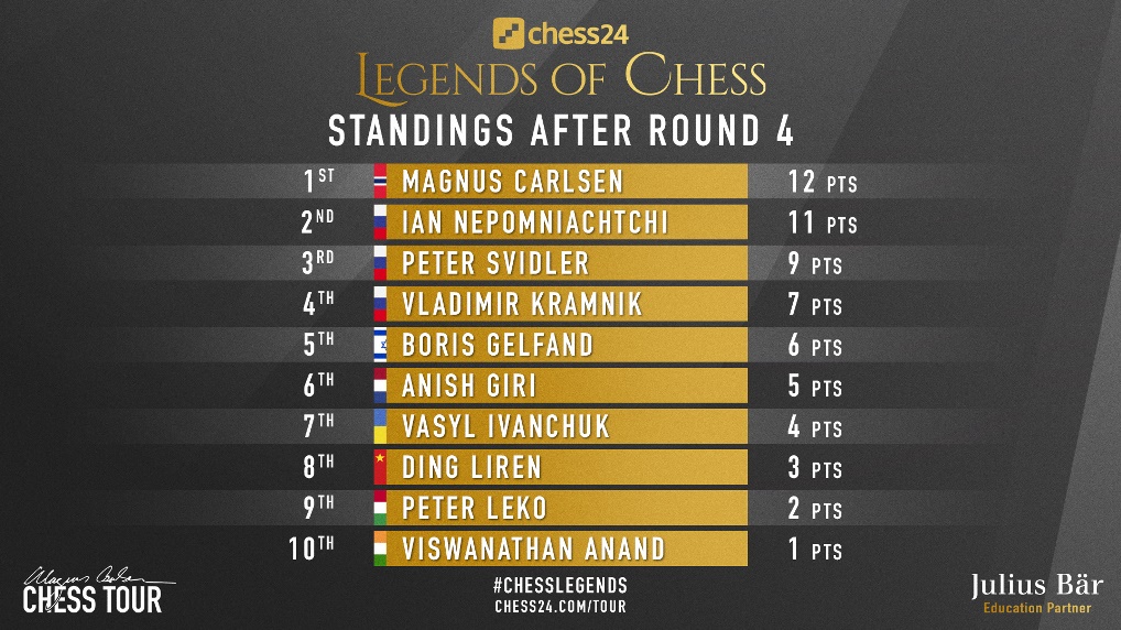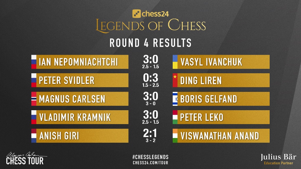 Magnús Carlsen er í banastuði á móti skákgoðsagnanna sem nú er í gangi á Chess24. Í gær yfirspilaði hann Boris Gelfand 3-0 og hefur 12 stig að loknum fjórum umferðum á mótinu. Ian Nepomniachtchi er annar með 11 stig eftir sigur á Vassily Ivanchuk með minnsta mun. Peter Svidler er þriðji með 9 stig eftir naumt tap gegn Ding Liren sem hafði tapað öllum viðureignum þar til gær. Vladimir Kramnik lagði Peter Leko að velli og er fjórði með 7 stig.
