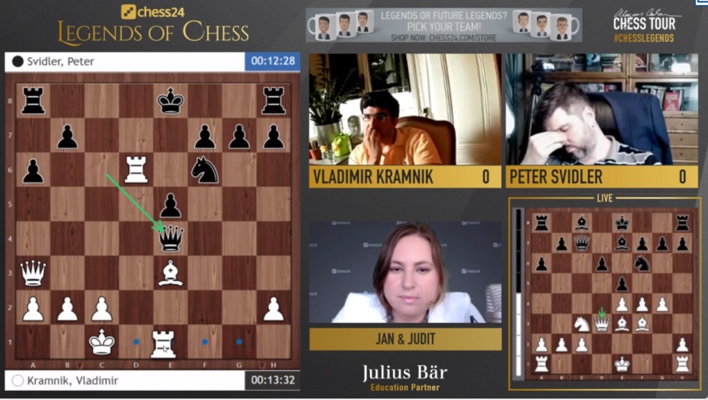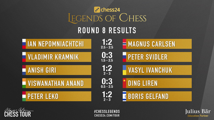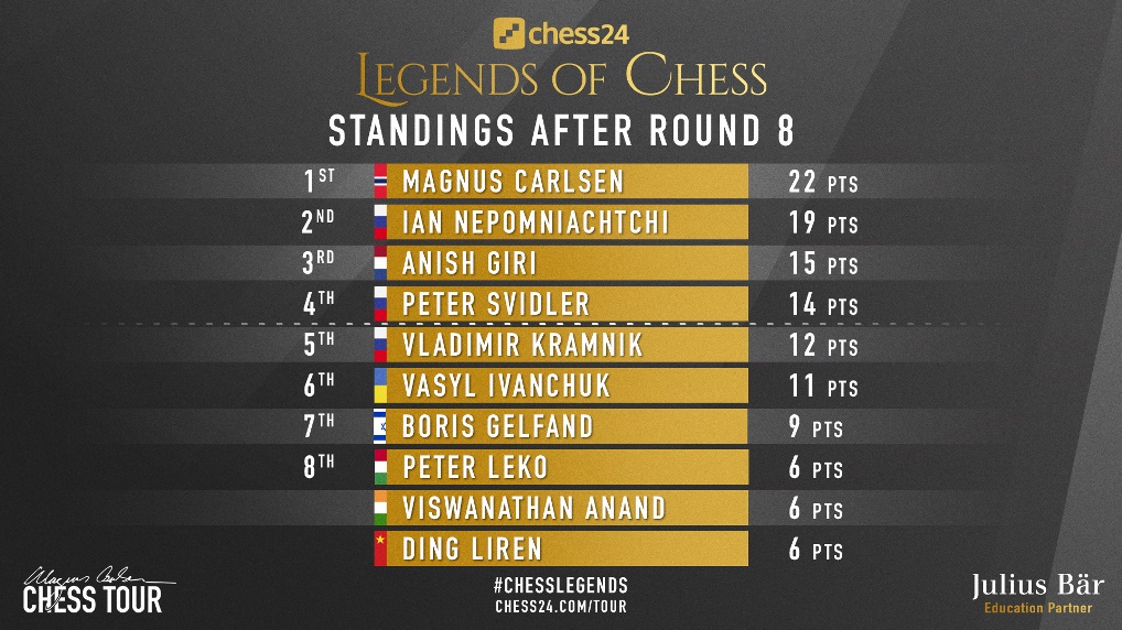 Lokaumferð undankeppni móts skákgoðsagnanna fer fram í dag. Carlsen vann Nepo eftir bráðabana í gær og Svidler vann mikilvægan sigur á Kramnik. Magnús hefur tryggt sér sigur á mótinu. Nepo hefur tryggt sér annað sætið. Anish Giri hefur einnig tryggt sér keppnisrétt í útsláttarkeppninni. Þrjár viðureignir fóru í bráðabana í gær.