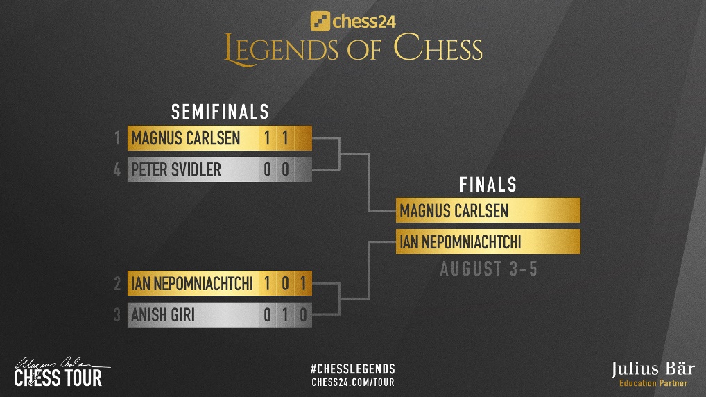 Úrslitin hjá Skákgoðsögnunum á Chess24 hefjast í dag. Magnús Carslen mætir Ian Nepomniachtchi. Magnús vann öruggan sigur á Peter Svidler og þurfti aðeins til þess tvö einvígi sem hann vann bæði 2,5-0,5