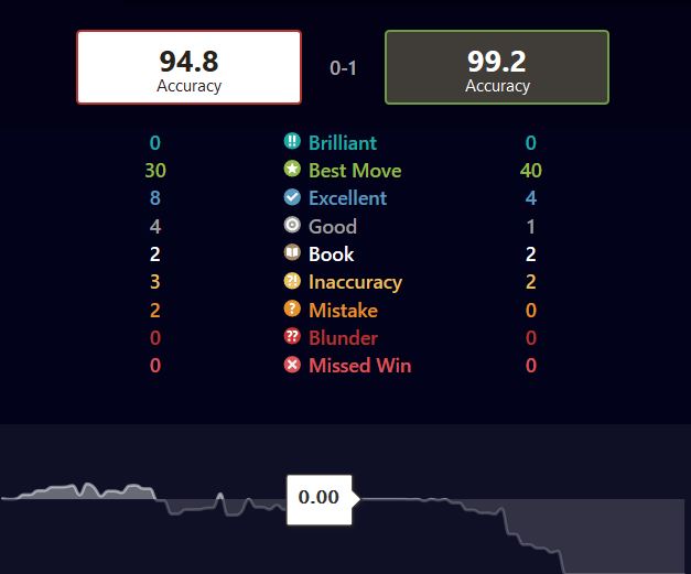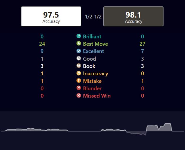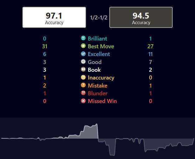 Dagur nýtti færið og hrifsaði til sín frumkvæðið og neyddi Braga til að gefa drottninguna fyrir nægar bætur þegar kemur að liðsafla en engan veginn þegar kemur að virkni liðsafla. Dagur stóð því til vinnings. Bragi barðist hinsvegar áfram og rokkaðist skákin úr því að vera jöfn í vinning á svart og loks gafst Dagur upp á vinningstilraunum í lokin og þráskákaði. Mögulega voru enn vinningsmöguleikar í boði þá en staðan mjög furðuleg og erfitt að meta.