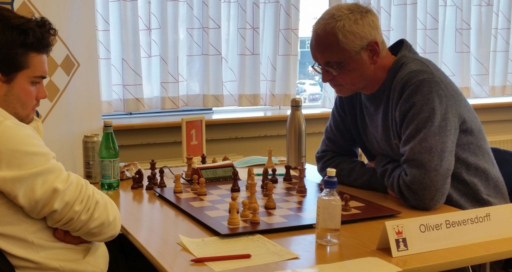 19:30 – Aron Þór Mai og Oliver Bewerdorff sitja á fyrstu borði – allt í uppnámi – kóngur hvíts á e2 og kóngur svarts á d7 – drottningarnar horfnar yfir móðuna miklu enn samt allt óskýrt og óliðandi spennandi.