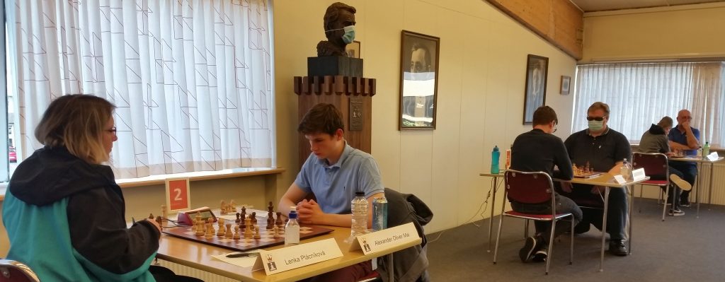 20:00 Svakaleg barátta á sér stað á flestum borðum – Lenka Ptáčníková og Alexander Oliver Mai berjast á öðru borði – skákin virðist vera í jafnvægi. Ritarinn skilur minna í stöðunni á þriðja borði – Pétur Pálmi Harðarson er með hvítt gegn Jóhanni Hirti Ragnarssyni. Ragnar fornar biskup á e5 – og það virðist vera tveir menn í uppnámi. Ekkert sést á svip Ragnars – hann er vel falinn bak við grímuna. Enn stuttu seinna gefst hann upp – hann hefur fórnað of miklu liði.