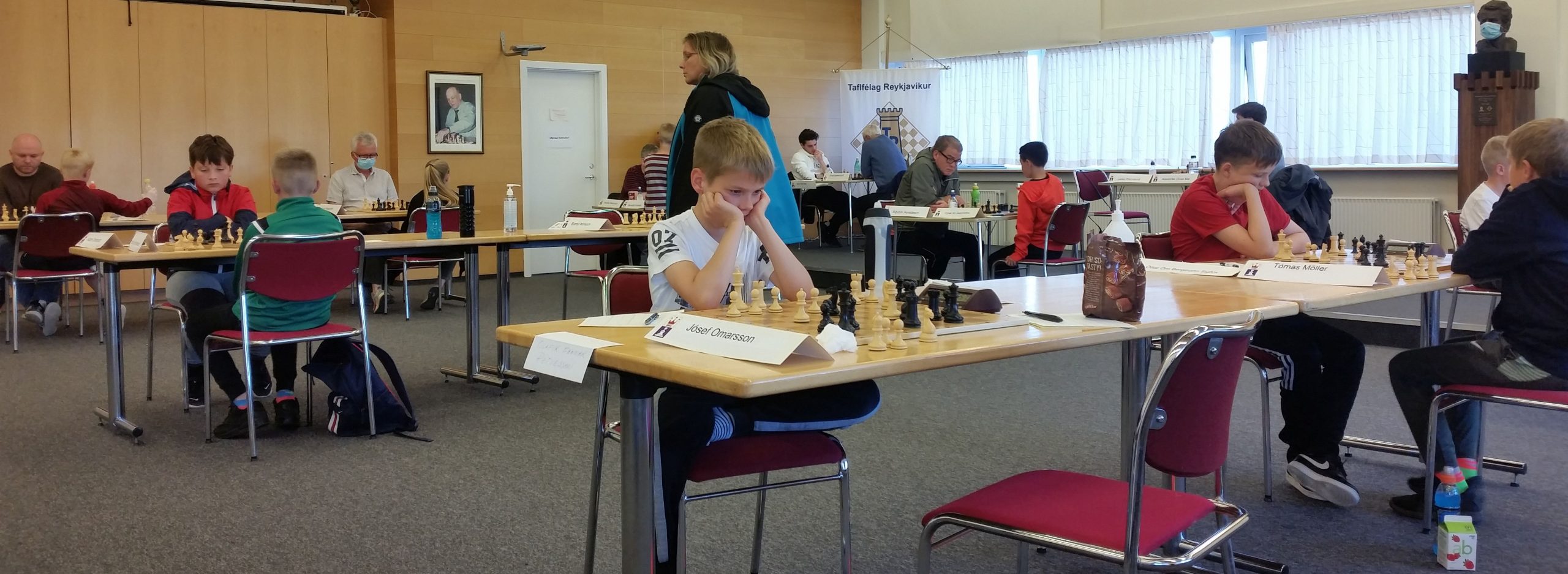 Arnar Freyr Orrason vinnur Markús Orra Jóhannsson á 16 borði. Þetta eru ungir strákar og báðir tefla mjög vel.