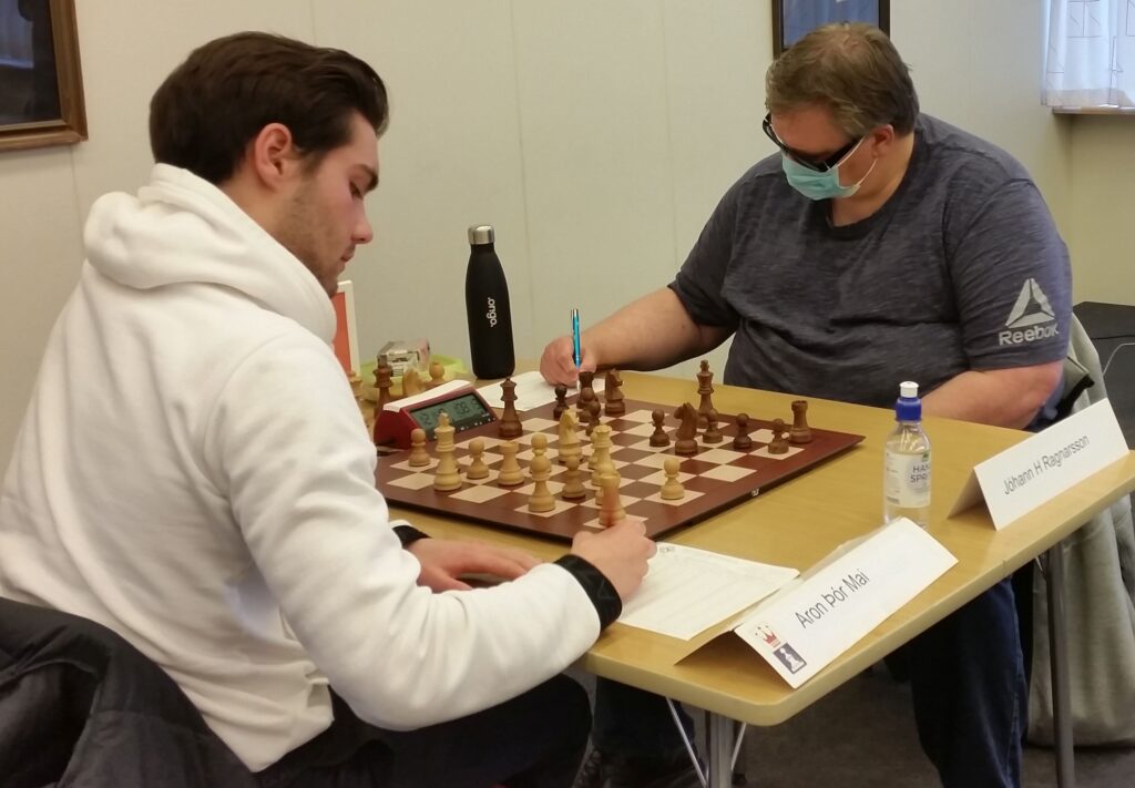 20:00 Elvar Már gefst upp á fyrsta borði – erfitt að tefla manni undir og á móti sterkum andstæðingi.