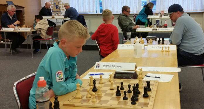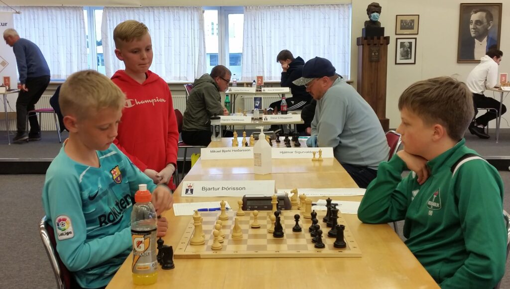 Borð 11: Mikael Bjarki Heiðarsson teflir aðra góða skák. Andstæðingurinn Hjálmar Sigvaldason verður að trúa á kraftaverk – annaðhvort mát eða þráskák ef hann á að bjarga skákinni. Mun varla gerast.