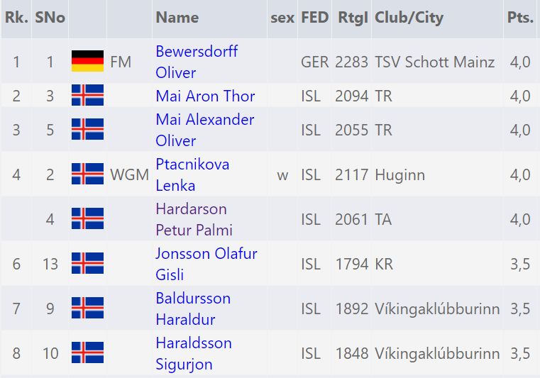 Þá er fimm efstir og jafnir með 4 vinninga. Mótið er æsispennandi. Í næstu umferð mætist stigahæstu keppendurnir Oliver Bewerdorff og Lenka P.