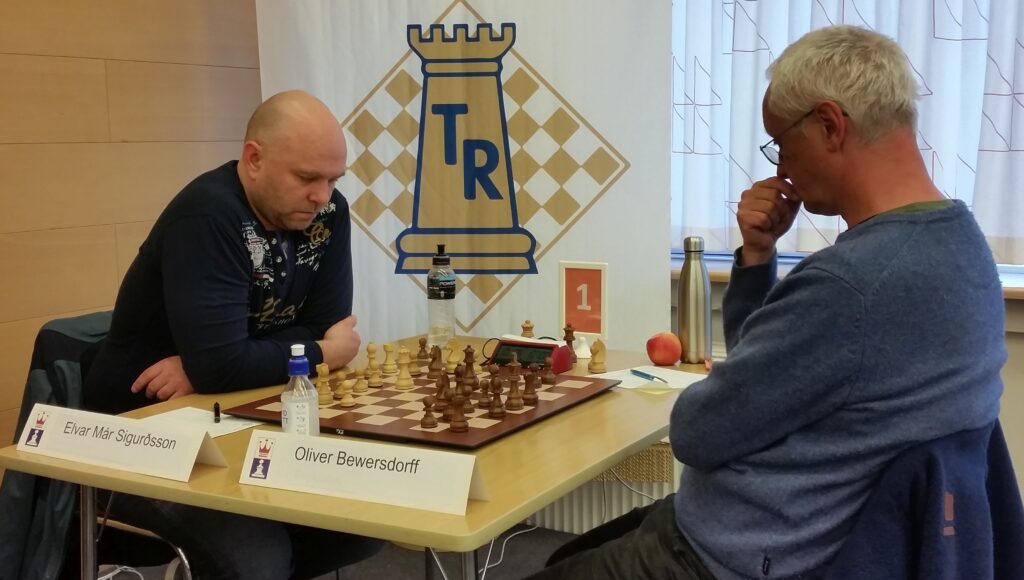19:30 Elvar Már Sigurðsson virðist hafa leikið af sér mann á efsta borði á móti Oliver Bewersdorff. Oliver er í smá vandræði með að koma mönnunum út.