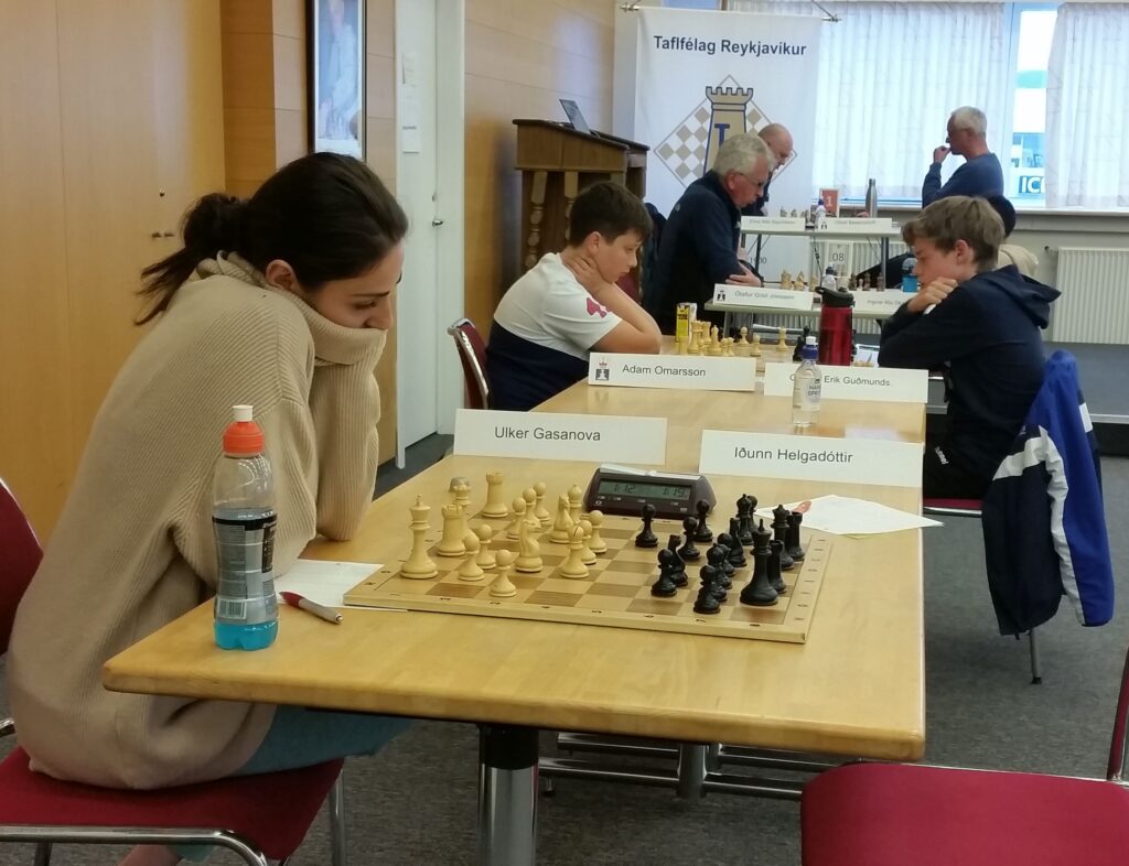 Borð 10: Sennilega eina skiptið sem þvær konur mætast í mótinu – Ulker Gasanova er með hvítt og hefur unnið peð á móti Iðunni Helgadóttur. En Iðunn hefur smá pressu í staðinn svo sennilega er staðan í jafnvægi. Nei – rangt Ulker finnur betra plan og hirðir tvö peð á kóngsvængnum.