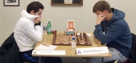 Borð-1: Oliver Bewersdorff byggir upp stöðu sína hægt og örugglega og vinnur öruggan sigur á Alexander Oliver Mai. 1-0.